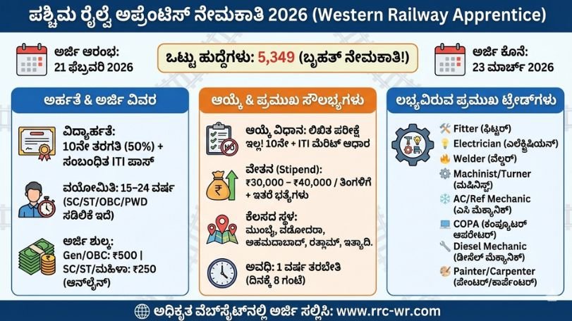 ರೈಲ್ವೆ ಇಲಾಖೆಯಲ್ಲಿ ಕೆಲಸ ಮಾಡಬೇಕು ಎಂಬುದು ಅನೇಕ ಯುವಕರ ಕನಸು. ಆ ಕನಸನ್ನು ನನಸು ಮಾಡುವ ಭರ್ಜರಿ ಅವಕಾಶ ಈಗ ಲಭ್ಯವಾಗಿದೆ. RRC Western Railway ವತಿಯಿಂದ 2026ನೇ ಸಾಲಿನ ಅಪ್ರೆಂಟಿಸ್ ನೇಮಕಾತಿ ಅಧಿಸೂಚನೆ ಪ್ರಕಟವಾಗಿದ್ದು, ಒಟ್ಟು 5,349 ಹುದ್ದೆಗಳಿಗೆ ಆನ್ಲೈನ್ ಅರ್ಜಿ ಆಹ್ವಾನಿಸಲಾಗಿದೆ.